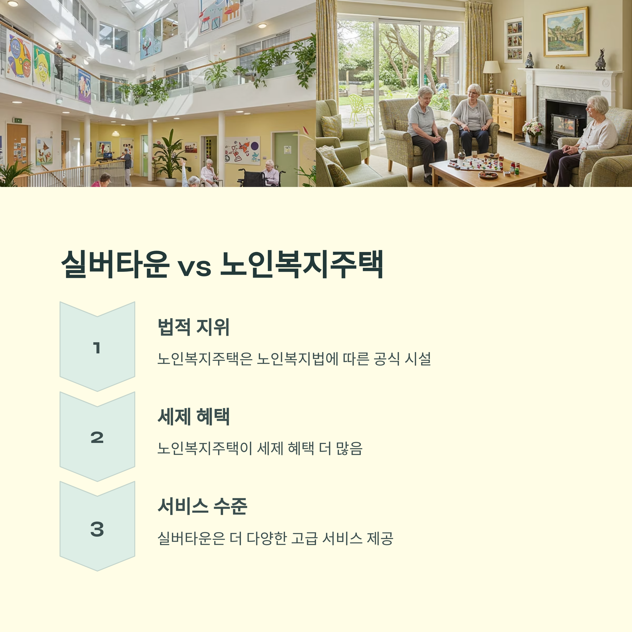 A3: ์ค๋ฒํ์ด๊ณผ ๋ ธ์ธ๋ณต์ง์ฃผํ์ ๊ฐ์ฅ ํฐ ์ฐจ์ด๋ ๋ฒ์ ์ง์์ ์ ๊ณต๋๋ ์๋น์ค์ ๋๋ค. ๋ ธ์ธ๋ณต์ง์ฃผํ์ '๋ ธ์ธ๋ณต์ง๋ฒ'์ ๋ฐ๋ผ ์ด์๋๋ ๊ณต์ ์์ค๋ก ์ธ์ ํํ์ด ์๋ ๋ฐ๋ฉด, ์ค๋ฒํ์ด์ ๋ฏผ๊ฐ ๊ธฐ์ ์ด ์ด์ํ๋ ์ฃผ๊ฑฐ ์์ค๋ก ๋ ๋ค์ํ ๊ณ ๊ธ ์๋น์ค๋ฅผ ์ ๊ณตํ๋ ๊ฒฝํฅ์ด ์์ด์. ์ด๊ฒ์ ๊ณต๋ฆฝํ๊ต์ ์ฌ๋ฆฝํ๊ต์ ์ฐจ์ด์ ๋น์ทํฉ๋๋ค. ๋ ธ์ธ๋ณต์ง์ฃผํ์ ๋ณด๋ค ์ ๋์ ๋ณดํธ๋ฅผ ๋ฐ์ง๋ง ์๋น์ค๊ฐ ๊ธฐ๋ณธ์ ์ธ ๋ฐ๋ฉด, ์ค๋ฒํ์ด์ ๋ ๋ง์ถคํ ์๋น์ค๋ฅผ ์ ๊ณตํ์ง๋ง ๋น์ฉ์ด ๋๊ณ ๊ท์ ๊ฐ ๋ํ ํธ์ ๋๋ค.